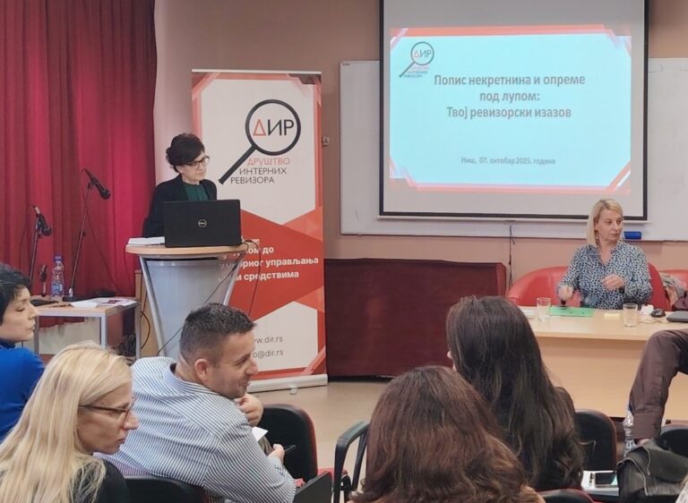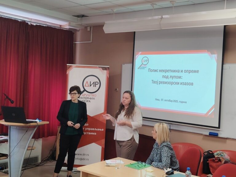 Tim predavača – koleginice Jelena Kovačević, rukovodilac Službe interne revizije organa i službi Grada Niša, i Nina Đurić, ovlašćeni interni revizor u javnom sektoru u Službi interne revizije grada Pirota i ovlašćeni računovođa, nesebično je sa kolegama podelio bogato praktično iskustvo svojih timova. Učesnici su upoznati sa brojnim izazovima u reviziji popisa nekretnina i opreme, od primene relevantnih propisa do praktičnih aspekata sprovođenja revizije ovog sistema, njenim značajem za tačnost finansijskih izveštaja i zaštitu javne imovine.