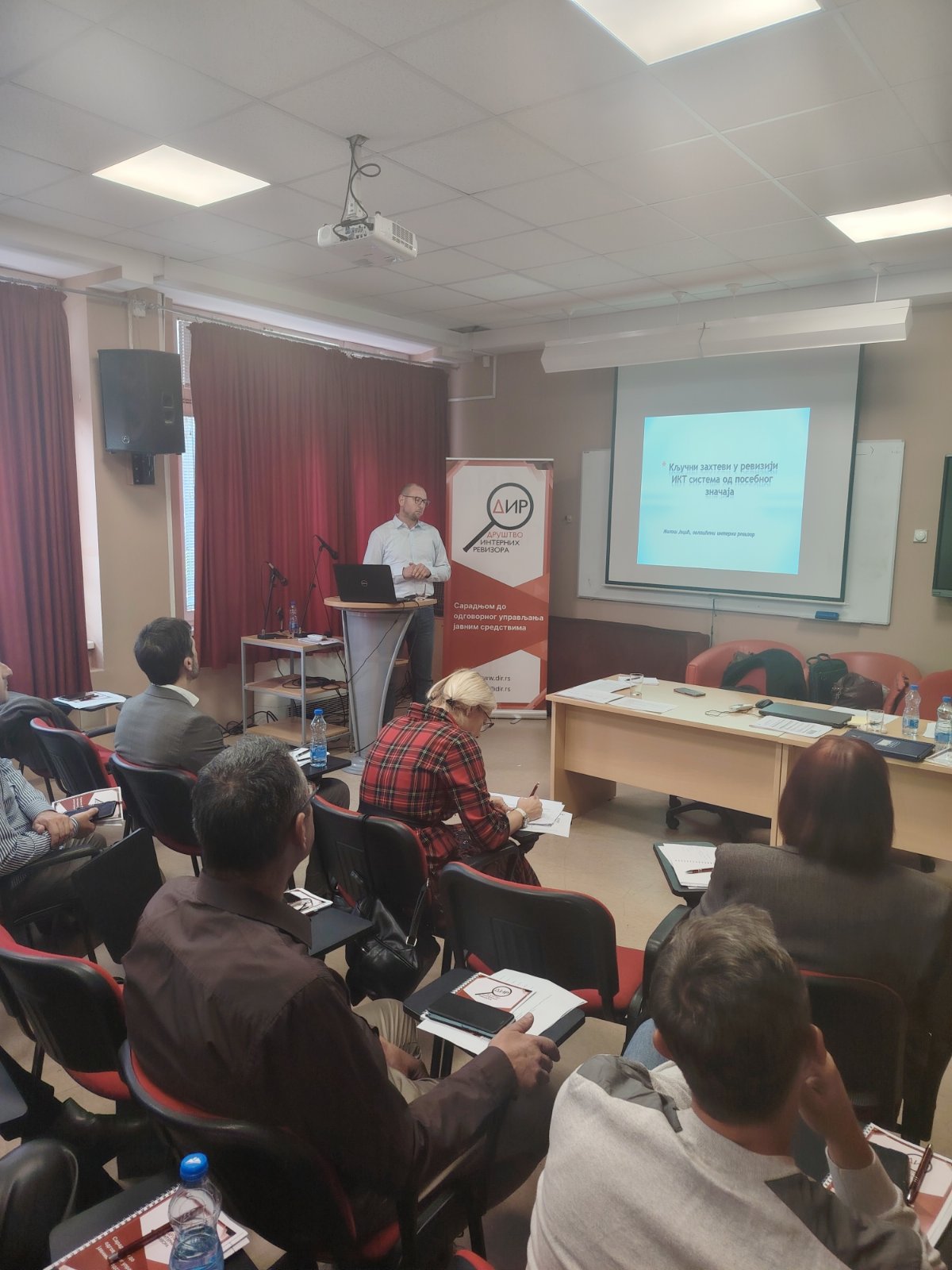 Kolega Miloš Jocić, rukovodilac Odseka interne revizije u Specijalnoj bolnici za psihijatrijske bolesti ”Gornja Toponica”, upoznao je učesnike sa ključnim zahtevima u reviziji IKT sistema od posebnog značaja. Objasnio je kako redovna provera ovih sistema osigurava pouzdanost podataka, bezbednost i usklađenost sa propisima i podstakao kolege da se u narednom periodu aktivno upuste u ovu reviziju.